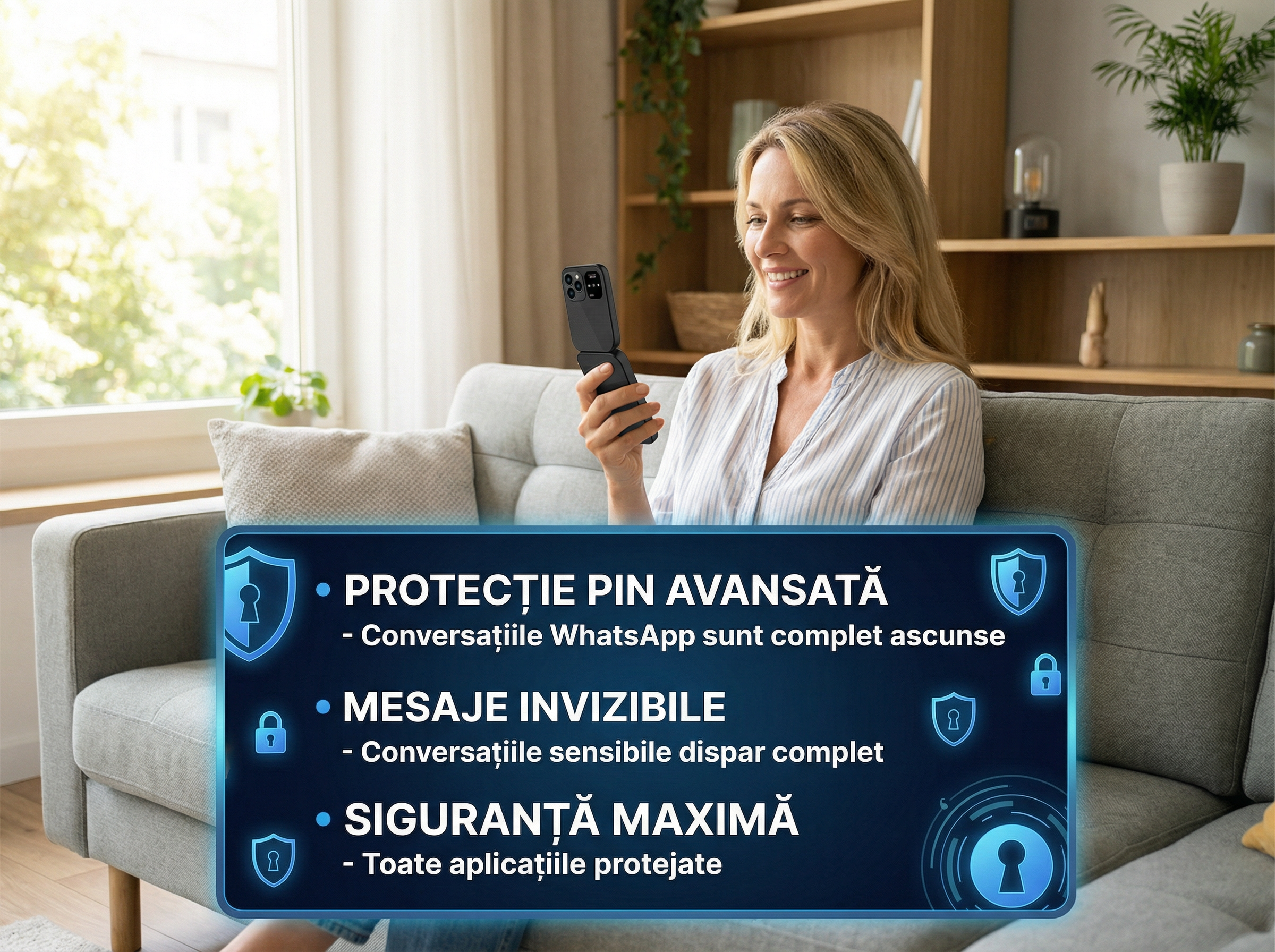Conversațiile WhatsApp sunt complet ascunse cu un sistem PIN cunoscut doar de tine. Nimeni nu poate accesa mesajele — nici măcar soția/soțul dacă îți ia telefonul.